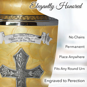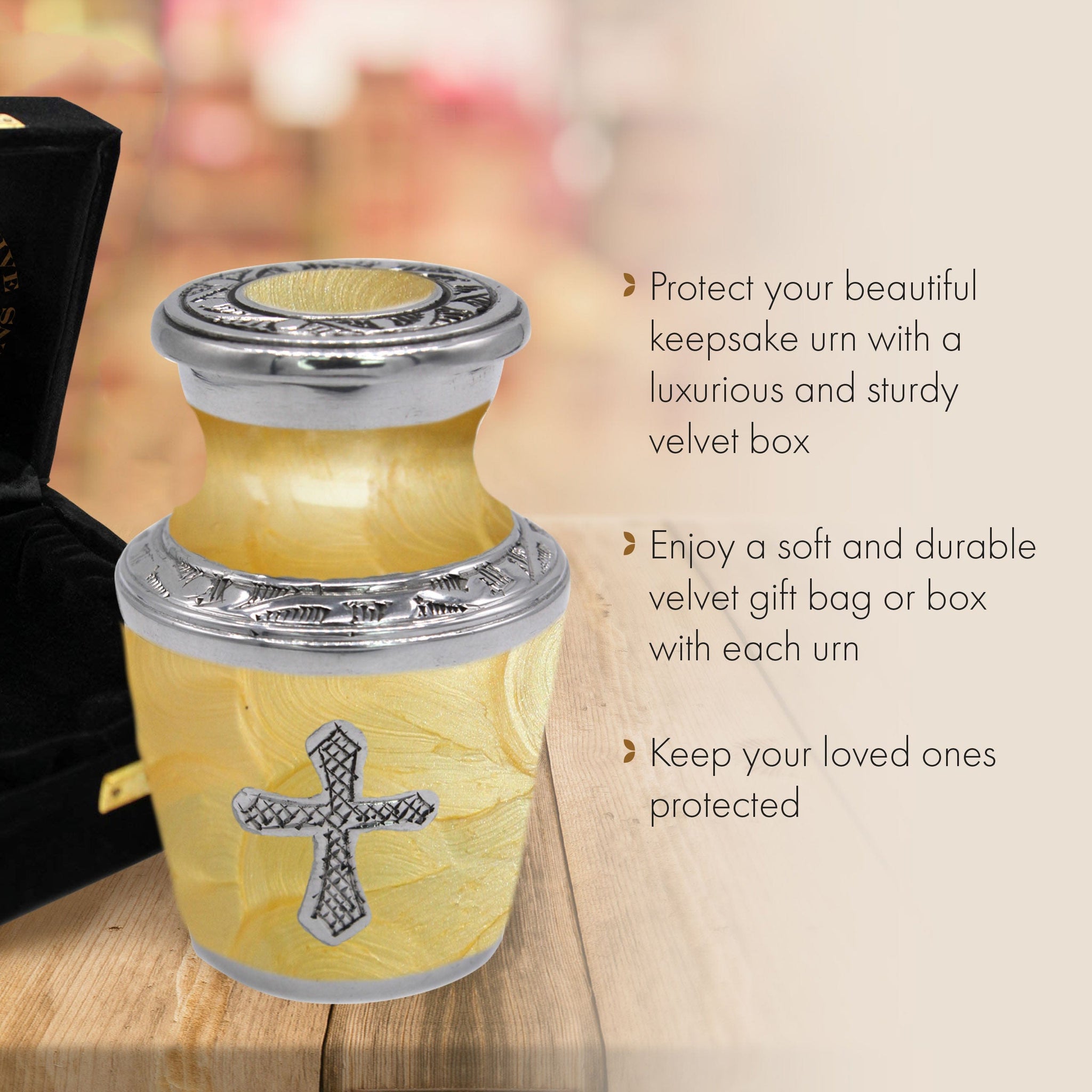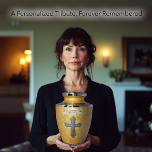 Our Glory to God Cross cremation urns for adult ashes is made of solid brass and features a beautiful engraved cross with rose accents, and surrounded by shimmering hand painted swirls. Each cremation urn is handmade to perfection by an ancient process called sand casting and is made of solid brass and is constructed to last without tarnishing. Handcrafting provides each urn with its own unique variation in color, finish and texture -- so no two urns are exactly alike. Truly, a one-of-a-kind urn to cherish your loved one. The urn has a screw-top lid for easy handling and secure display. It is ideal for home, columbarium, scattering, or burial. (Note: 1lbs weight prior to cremation equals to 1 cubic inch after cremation). Comes with a velvet gift bag or box.