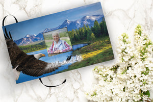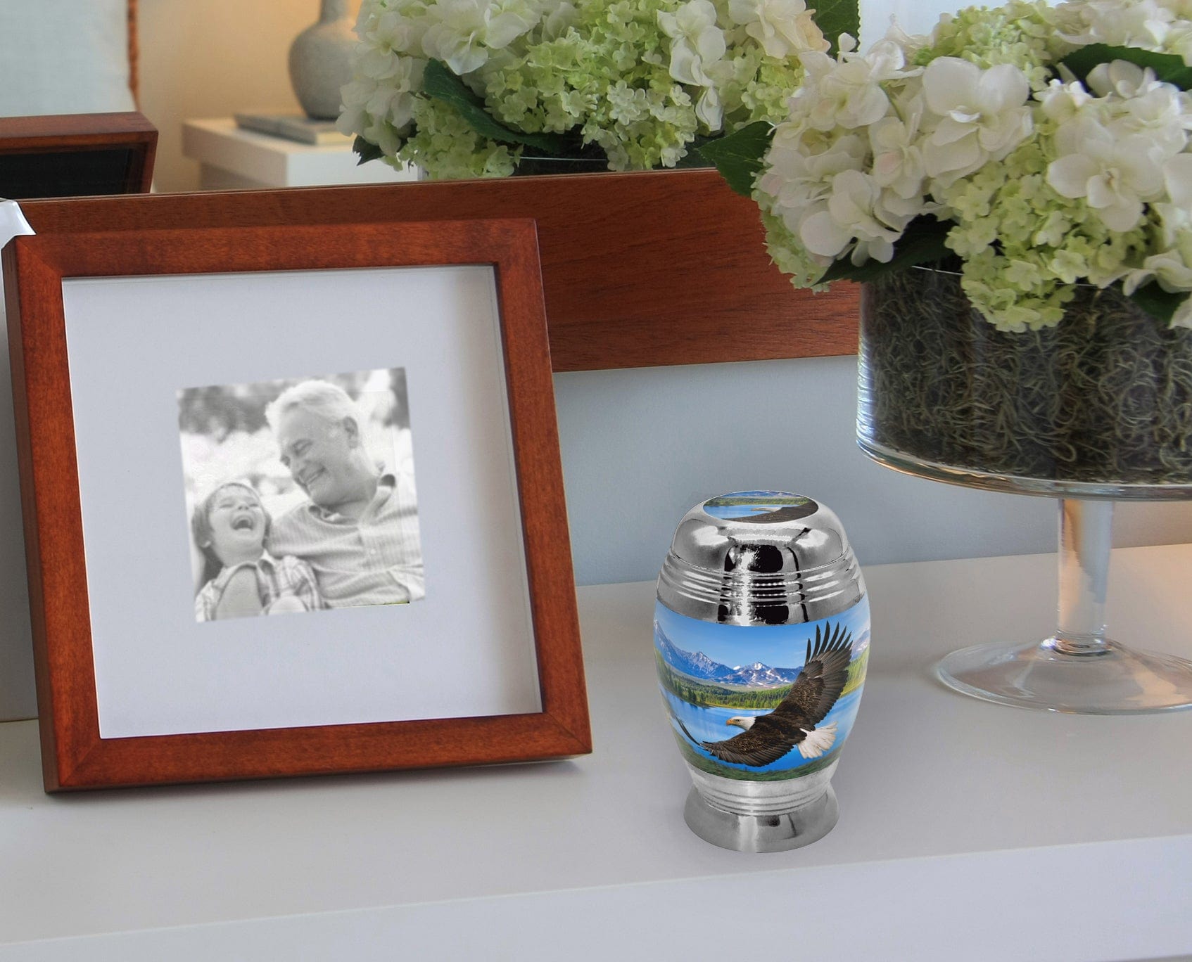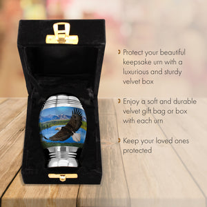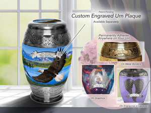Our metal eagle cremation urns and burial urns for cremated remains are designed to warm your heart with memories. These urns for cremation and urns for human ashes come in Large, XL and small serve as a beautiful works of art within your home. Our Bald Eagle Cremation Urns for human ashes and memorial urn is a scenic and freeing tribute for your loved one, and features a wild bald eagle soaring above a mountain scape.