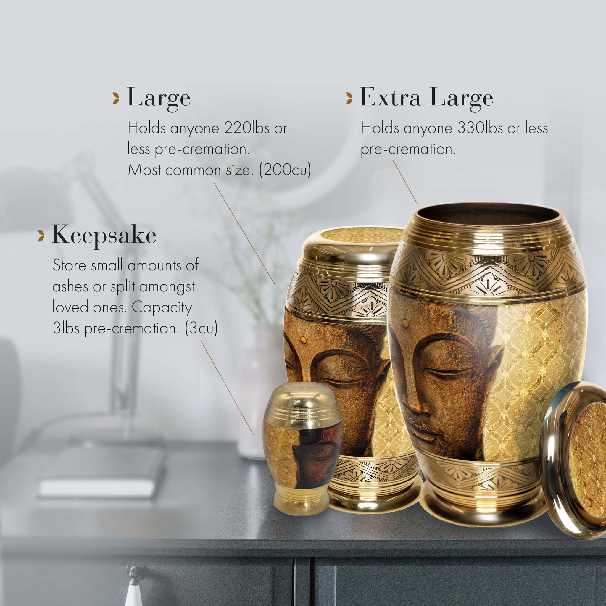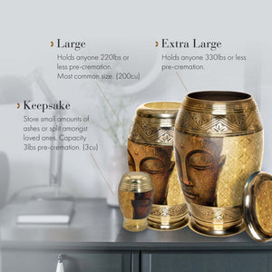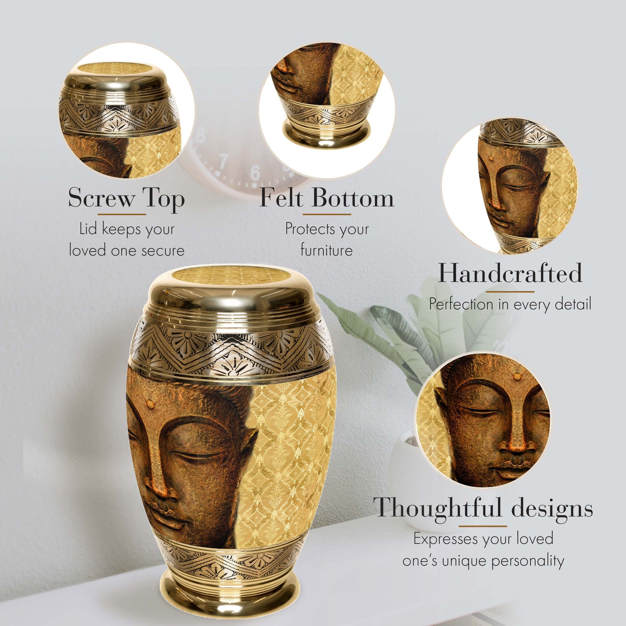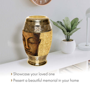Our Golden Buddha Cremation Urn is a calm and symbolic tribute to your loved one. Bold & Commemorative, it features a Buddha on an intricate golden finish.