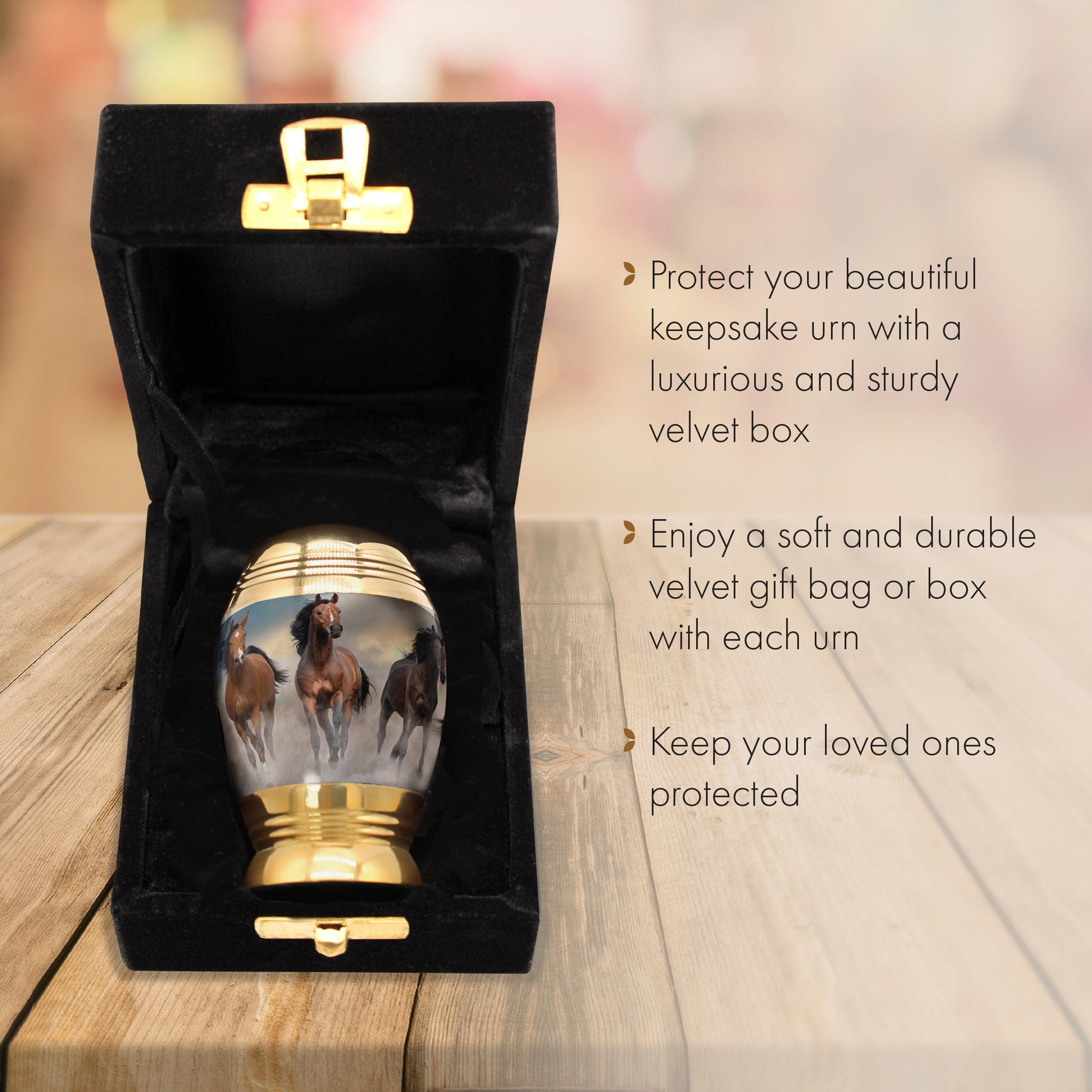 Each horse urn is carefully handcrafted with fine details, ensuring a design that feels both elegant and enduring. Built from high-quality materials, it provides lasting protection for your loved one's remains, while the secure screw-top lid ensures their safety. The soft felt-lined base prevents scratches, making this urn suitable for display in your home.