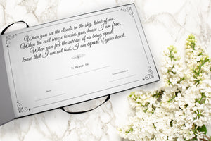 Our matching themed funeral guest books coordinates perfectly with any elegant Commemorative Cremation designed urn or scattering tube. Large and vivid, the dimensions are 14 inches W x 8 inches H, and contain high resolution imagery featuring the words Celebration of Life in beautiful, easily readable script. The strong hardcover means this Memorial Guest Book for Funeral will last for generations.