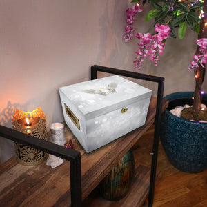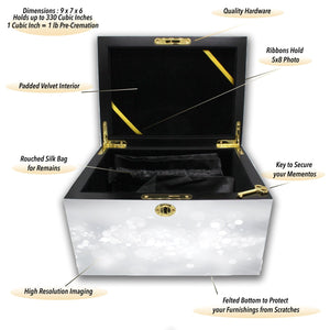 Our Memorial Collection Chest Cremation Urns for human ashes adult or child are designed to not only provide a final resting place for your loved one forever, but serve as a beautiful work of art within you home, niche, or columbarium. Our Memento Collection Chests are handmade and specifically designed to provide a functional and secure tribute. Lock and key to protect and secure your utmost treasured contents. A Satin drawstring bag is included to hold actual remains. Gold ribbons sewn into the inner lid for photo placement or token or remembrance. Felted bottom the protect your furnishings from scratches.