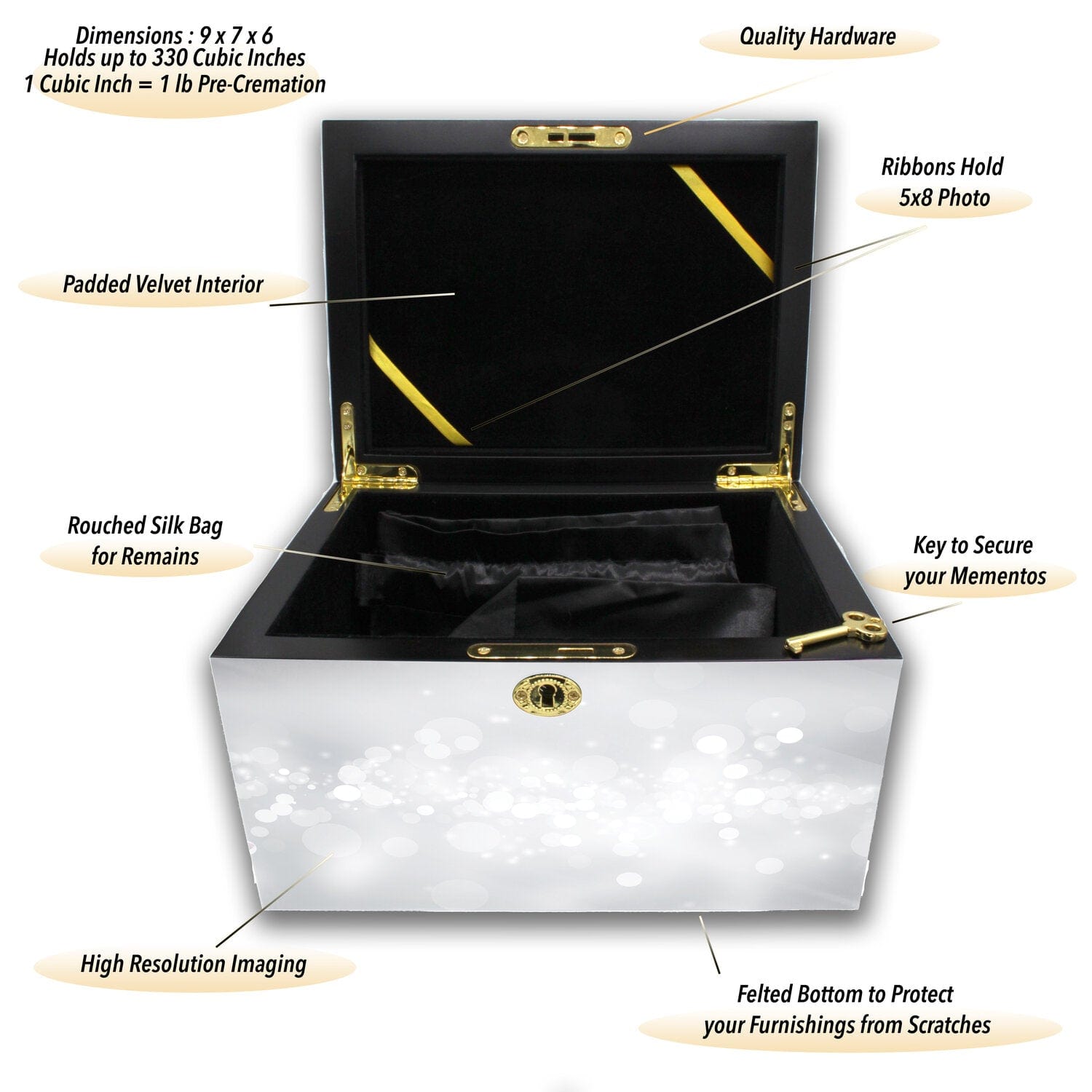 SIZING & CAPACITY INFORMATION: Sized with purpose, each Cremation Urn Memento Collection Chest is 9.5 W x 6 H x 7 W, (inches), giving a generous interior capacity of 330 cubic inches (1 cubic inch equals to 1lbs pre-cremation). This allows room to add not only your loved one’s remains, but important mementos for safe storage such as a wallet, passport, small journal, rings, coins, badges, pins, perfume, or other small tokens you would like to keep close.