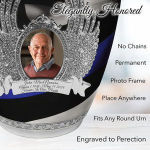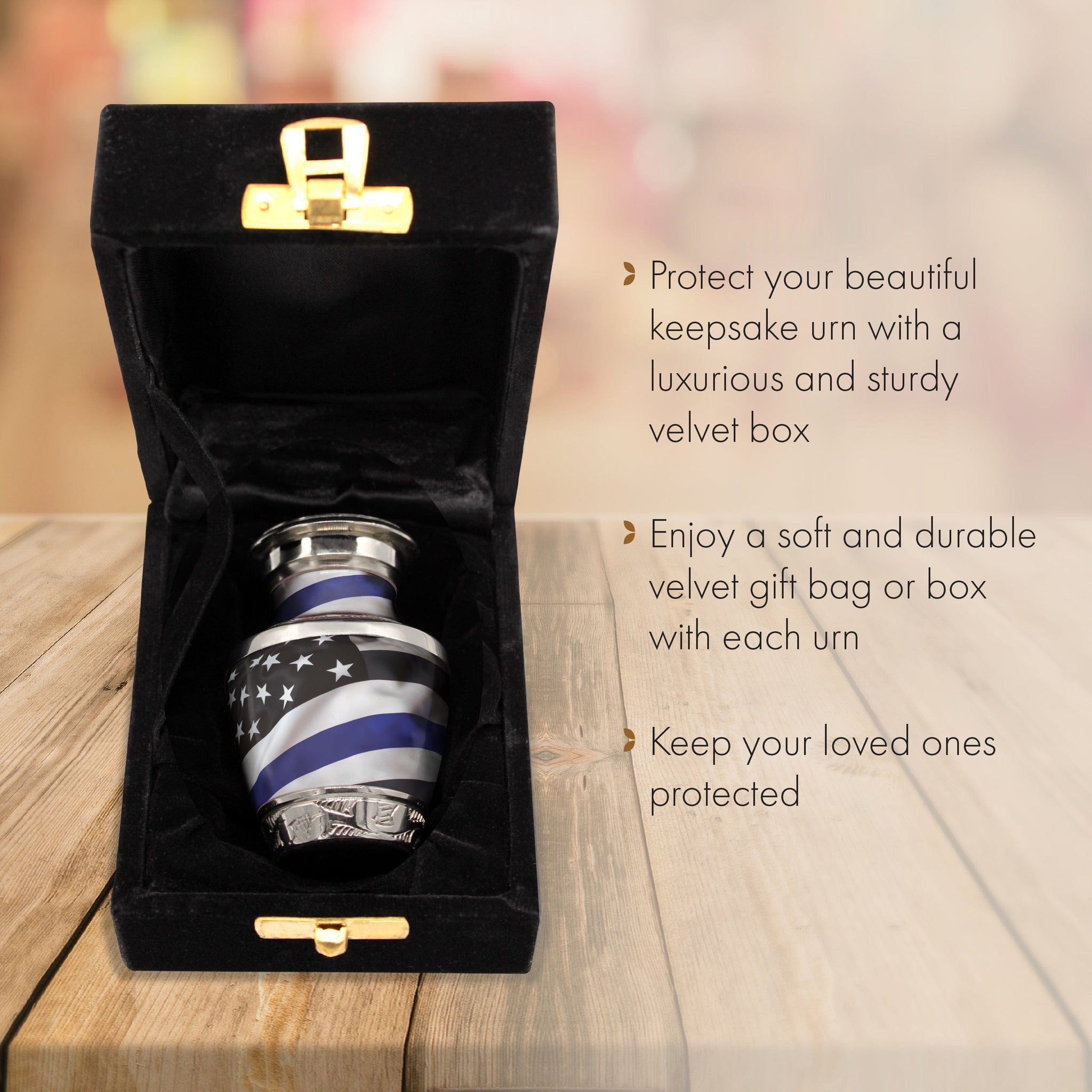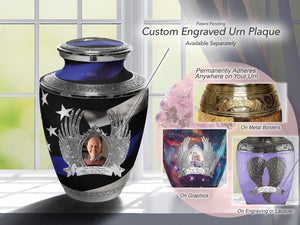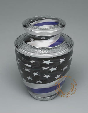 Our metal police cremation urns and burial urns for cremated remains are designed to warm your heart with memories. These urns for cremation and urns for human ashes come in Large, XL and small serve as a beautiful works of art within your home. Our Thin Blue Line Cremation Urns for human ashes and memorial urn is a patriotic tribute to your loved one. Bold and commemorative, it features an image of the Thin Blue Line Flag.
