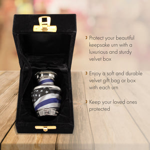 Our patriotic urns are both a respectful resting place for a loved one and a beautiful work of art for your home. Our designers are dedicated to creating urns with you in mind, allowing us to create elegant and meaningful urns that serve as a respectful resting place for your loved one and add beauty to your home. This family of cremation urns features an American flag, an American flag with a red line, or an American flag with a blue line. These are the perfect patriotic urns to celebrate the life of a loved one, especially former firefighters, police officers, and first responders.